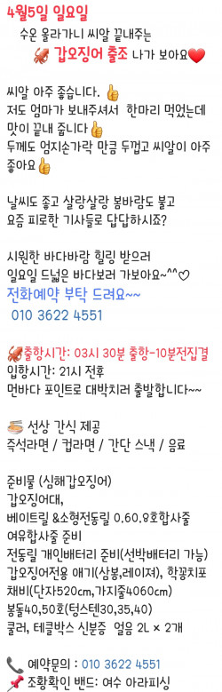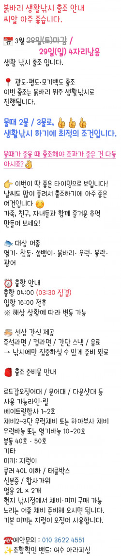 ⚓️여수 아라피싱호 예약 안내 ⚓️ ⭐️예약문의 : 010-3622-4551 , 010-5629-7913⭐️입금계좌 : 2020.4606.9103 수협 최재성⭐️오시는길 : 전남 여수시 신월1길 32 (네비게이션)⭐️홈페이지 : https://arafishing.sunsang24.com⭐️밴드주소 : https://band.us/band/95591418 ✨전화예약 부탁드립니다✨ 010 3622 4551/010 5629 7913입금시 입금자 성함 필히 문자 남겨주세요‼️입금시 우선 예약확정‼️ ⭐️선사 편의시설음료, 라면(컵라면,한강라면), 생수, 커피(믹스,원두), 차,과자, 제빙기⭐️선사 지급품석식, 야식, 미끼, 7단기둥출, 얼음, 봉돌 ⭐️선사대여품낚시대,쿨러 - 1만원 (아침에 스티로폴 1개 지급)전동릴 - 2만원- 분실 & 파손시 배상- 예약시 미리 말씀해주세요⭐️자리배정- 추첨제로 진행합니다-1번 #1번자리 배정, 2번 #2번자리 배정 순서대로-우선배정단체, 연박