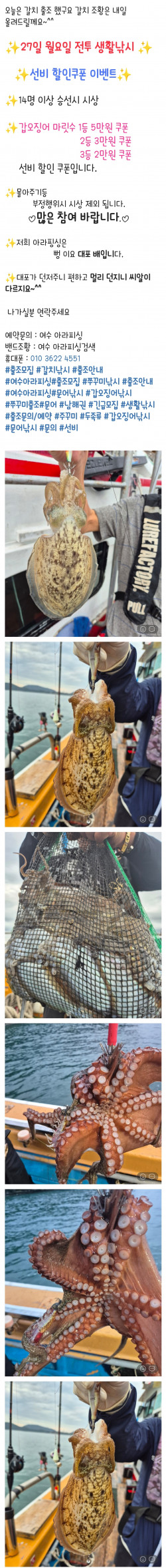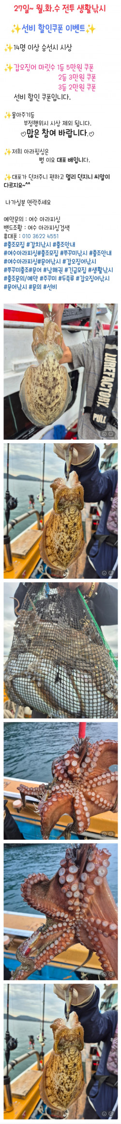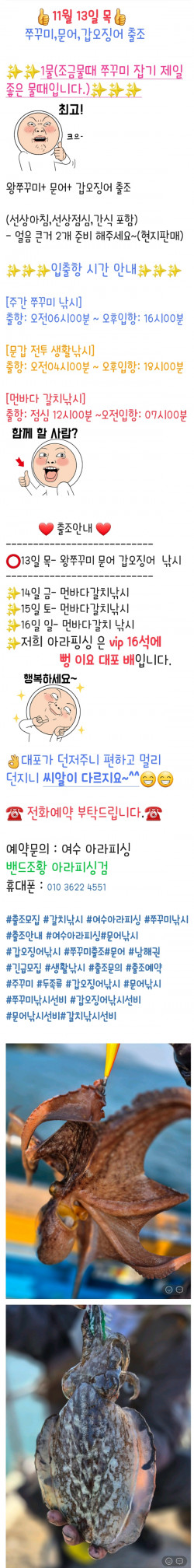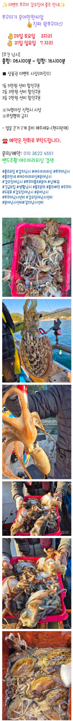 앞으로 기상악화로 먼바다 갈치 출조가 당분간 어렵습니다. 그래서 준비한 특별 이벤트 금요일 17일 신나는 생활낚시 쭈꾸미, 문어,갑오징어 나가보아요갈치는 냉동실에 많으니 다른것도 잡으러가요 요즘 쭈갑문 조황이 좋다고 하네요그날 3물이라 날이 끝내주네요물때가 좋으니✨️오전 ✨️오후✌️두번 나가봅니다.원하는 시간으로 예약 주세요♡ 금요일 17일 ✨️오전반✨️ 오전 5시30분 출항 12시30분 입항 ✨️오후반 ✨️ 오후 2시출항 9시입항 5만원에 모십니다. 5만원에 바람도 쐐고 배도 타고 문어 한마리만 잡아도 본전 뽑으니 나가 보시죠^^나가실분 연락주세요밴드조황 검색: 여수 아아라피싱예약 휴대폰 : 010 3622 4551#출조모집 #쭈꾸미낚시 #출조안내 #여수아라피싱#문어낚시 #갑오징어낚시 #쭈꾸미출조#문어 #남해권 #긴급모집 #생활낚시 #출조문의/예약 #주꾸미 #두족류 #갑오징어낚시 #문어낚시 #문의 #선비 ⚓️여수 아라피싱호 예약 안내 ⚓️ ⭐️예약문의 : 010-3622-4551 , 010-5629-7913⭐️입금계좌 : 2020.4606.9103 수협 최재성⭐️오시는길 : 전남 여수시 신월1길 32 (네비게이션)⭐️홈페이지 : https://arafishing.sunsang24.com⭐️밴드주소 : https://band.us/band/95591418 ✨예약사이트를 이용하시면 훨씬 빠르고 편합니다✨ 입금시 입금자 성함 필히 문자 남겨주세요‼️입금시 우선 예약확정‼️ ⭐️선사 편의시설음료, 라면(컵라면,한강라면), 생수, 커피(믹스,원두), 차,과자, 제빙기⭐️선사 지급품석식, 야식, 미끼, 7단기둥출, 얼음, 봉돌 ⭐️선사대여품낚시대,쿨러 - 1만원 (아침에 스티로폴 1개 지급)전동릴 - 2만원- 분실 & 파손시 배상- 예약시 미리 말씀해주세요⭐️자리배정- 추첨제로 진행합니다-1번 #1번자리 배정, 2번 #2번자리 배정 순서대로-우선배정단체, 연박하시는 분들 우선배정합니다‼️단체4인이상 손님은 선 배정‼️늦게 오시면 남은 자리에 앉으실수 있습니다⭐️ 갈치 필수준비갈치전용대, 전동릴, 쿨러, 10단기둥줄, 갈치바늘, 집어등, 쪽가위, 칼, 면장갑,구명조끼,신분증저희는 멀미약을 지급하지 않습니다음주를 절대 금합니다‼️올해도 넓게 16석으로 운영합니다‼️