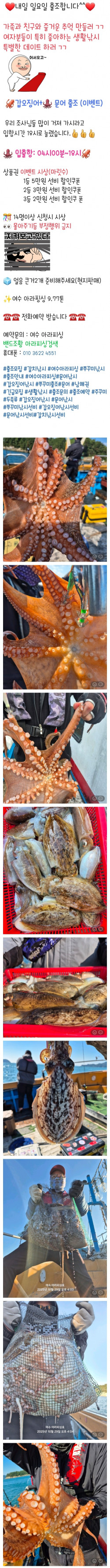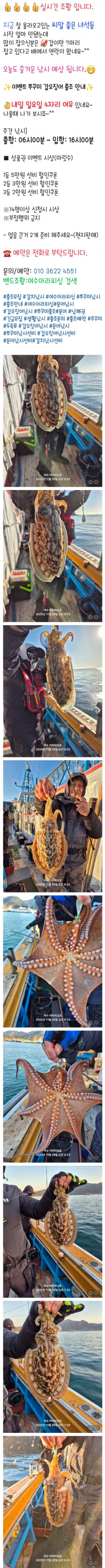 문어 실하고 마릿수도 잘 나옵니다.???????????? ???? 문어출조 하실분들 전화 예약 해주세요 ???? 예약문의 :여수 아라피싱휴대폰 : 010.3622.4551⚓️여수 아라피싱호 예약 안내 ⚓️ ⭐️예약문의 : 010-3622-4551 , 010-5629-7913⭐️입금계좌 : 2020.4606.9103 수협 최재성⭐️오시는길 : 전남 여수시 신월1길 32 (네비게이션)⭐️홈페이지 : https://arafishing.sunsang24.com⭐️밴드주소 : https://band.us/band/95591418 ✨예약사이트를 이용하시면 훨씬 빠르고 편합니다✨ 입금시 입금자 성함 필히 문자 남겨주세요‼️입금시 우선 예약확정‼️ ⭐️선사 편의시설음료, 라면(컵라면,한강라면), 생수, 커피(믹스,원두), 차,과자, 제빙기⭐️선사 지급품석식, 야식, 미끼, 7단기둥출, 얼음, 봉돌 ⭐️선사대여품낚시대,쿨러 - 1만원 (아침에 스티로폴 1개 지급)전동릴 - 2만원- 분실 & 파손시 배상- 예약시 미리 말씀해주세요⭐️자리배정- 추첨제로 진행합니다-1번 #1번자리 배정, 2번 #2번자리 배정 순서대로-우선배정단체, 연박하시는 분들 우선배정합니다‼️단체4인이상 손님은 선 배정‼️늦게 오시면 남은 자리에 앉으실수 있습니다⭐️ 갈치 필수준비갈치전용대, 전동릴, 쿨러, 10단기둥줄, 갈치바늘, 집어등, 쪽가위, 칼, 면장갑,구명조끼,신분증저희는 멀미약을 지급하지 않습니다음주를 절대 금합니다‼️올해도 넓게 16석으로 운영합니다‼️