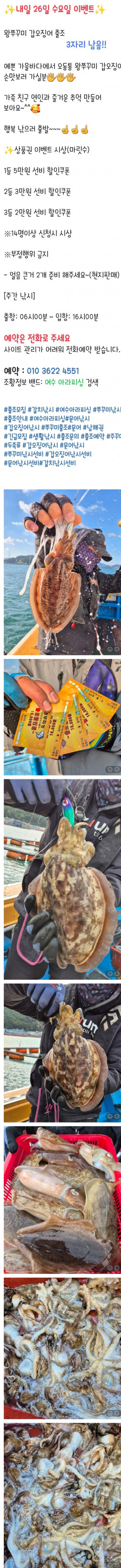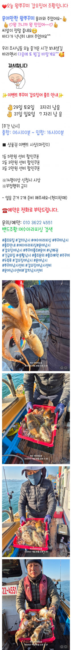 오늘 조황입니다. 실한 쭈꾸미 잘 올라와 주었어요~~ 잘 나오니 아주 즐겁게 낚시 하셨네요맑은 날씨 즐거운 하루 였습니다.✨️내일 일요일 2자리 남았습니다.[주간 쭈꾸미 낚시] 출항: 06시00분 ~ 입항: 16시00분 ■ 상품권 이벤트 시상(마릿수)1등 5만원 선비 할인쿠폰2등 3만원 선비 할인쿠폰3등 2만원 선비 할인쿠폰※14명이상 신청시 시상※부정행위 금지- 얼음 큰거 2개 준비 해주세요~(현지판매)☎️ 예약은 전화로 부탁드립니다.문의/예약: 010 3622 4551밴드조황:여수아라피싱 검색 ⚓️여수 아라피싱호 예약 안내 ⚓️ ⭐️예약문의 : 010-3622-4551 , 010-5629-7913⭐️입금계좌 : 2020.4606.9103 수협 최재성⭐️오시는길 : 전남 여수시 신월1길 32 (네비게이션)⭐️홈페이지 : https://arafishing.sunsang24.com⭐️밴드주소 : https://band.us/band/95591418 ✨전화예약 부탁드립니다✨ 010 3622 4551/010 5629 7913입금시 입금자 성함 필히 문자 남겨주세요‼️입금시 우선 예약확정‼️ ⭐️선사 편의시설음료, 라면(컵라면,한강라면), 생수, 커피(믹스,원두), 차,과자, 제빙기⭐️선사 지급품석식, 야식, 미끼, 7단기둥출, 얼음, 봉돌 ⭐️선사대여품낚시대,쿨러 - 1만원 (아침에 스티로폴 1개 지급)전동릴 - 2만원- 분실 & 파손시 배상- 예약시 미리 말씀해주세요⭐️자리배정- 추첨제로 진행합니다-1번 #1번자리 배정, 2번 #2번자리 배정 순서대로-우선배정단체, 연박하시는 분들 우선배정합니다‼️단체4인이상 손님은 선 배정‼️늦게 오시면 남은 자리에 앉으실수 있습니다⭐️ 갈치 필수준비갈치전용대, 전동릴, 쿨러, 10단기둥줄, 갈치바늘, 집어등, 쪽가위, 칼, 면장갑,구명조끼,신분증저희는 멀미약을 지급하지 않습니다음주를 절대 금합니다‼️올해도 넓게 16석으로 운영합니다‼️