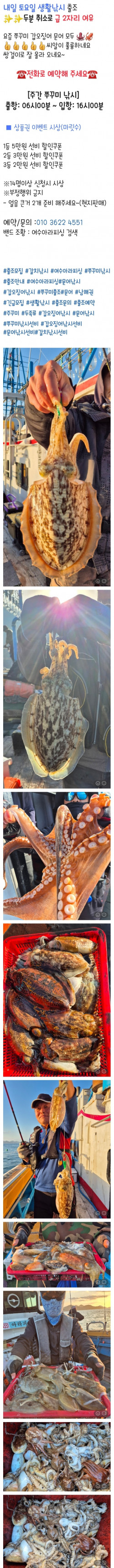 헉~날이 뒤집어 졌네요~~ 내일부터 갈치는 쭉~~~ 못나가서 취소 합니다. 그래서 내만권 생활 낚시 이벤트 갑니다. 내일 18일 토요일19일 일요일20일 월요일 쭈갑문 선비 이벤트 낚시대 이벤트도 함께 하니 많은 참여 부탁 드립니다. ✨️쭈꾸미 갑오징어 문어✨️토일월 모두주간 ⚔️전투낚시⚔️ 출항 : 04시30분 ~ 입항: 17시00분 준비 됐습니까~~~ 악! 준비 됏습니까~~~ 악! 하나☝️ 선비도 이벤트 중이니 전화로 물어봅니다.하나☝️ 예약도 전화로 합니다.하나☝️ 빠른 예약이 중요 합니다. ✨️낚시대 이벤트 시상✨️ 최고급 문어낚시대 (갑오징어 마릿수 1등) 14명이상 신청시 시상 한다. 일행 몰아주기등 부정행위시 자격 박탈 한다. 이상정정 당당 대결을 신청하지~~ 예약문의 : 여수 아라피싱밴드조황 아라피싱검색휴대폰 : 010 3622 4551 #출조모집 #갈치낚시 #출조안내 #여수아라피싱#출조모집 #쭈꾸미낚시 #출조안내 #여수아라피싱#문어낚시 #갑오징어낚시 #쭈꾸미출조#문어 #남해권 #긴급모집 #생활낚시 #출조문의/예약 #주꾸미 #두족류 #갑오징어낚시 #문어낚시 #문의 #선비⚓️여수 아라피싱호 예약 안내 ⚓️ ⭐️예약문의 : 010-3622-4551 , 010-5629-7913⭐️입금계좌 : 2020.4606.9103 수협 최재성⭐️오시는길 : 전남 여수시 신월1길 32 (네비게이션)⭐️홈페이지 : https://arafishing.sunsang24.com⭐️밴드주소 : https://band.us/band/95591418 ✨예약사이트를 이용하시면 훨씬 빠르고 편합니다✨ 입금시 입금자 성함 필히 문자 남겨주세요‼️입금시 우선 예약확정‼️ ⭐️선사 편의시설음료, 라면(컵라면,한강라면), 생수, 커피(믹스,원두), 차,과자, 제빙기⭐️선사 지급품석식, 야식, 미끼, 7단기둥출, 얼음, 봉돌 ⭐️선사대여품낚시대,쿨러 - 1만원 (아침에 스티로폴 1개 지급)전동릴 - 2만원- 분실 & 파손시 배상- 예약시 미리 말씀해주세요⭐️자리배정- 추첨제로 진행합니다-1번 #1번자리 배정, 2번 #2번자리 배정 순서대로-우선배정단체, 연박하시는 분들 우선배정합니다‼️단체4인이상 손님은 선 배정‼️늦게 오시면 남은 자리에 앉으실수 있습니다⭐️ 갈치 필수준비갈치전용대, 전동릴, 쿨러, 10단기둥줄, 갈치바늘, 집어등, 쪽가위, 칼, 면장갑,구명조끼,신분증저희는 멀미약을 지급하지 않습니다음주를 절대 금합니다‼️올해도 넓게 16석으로 운영합니다‼️