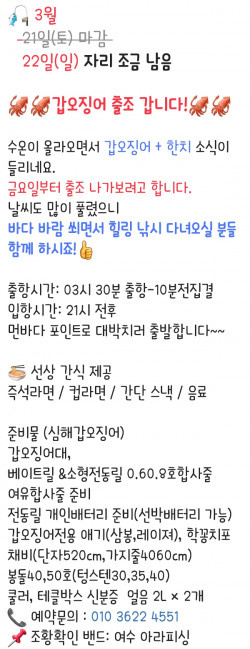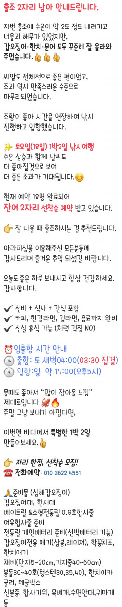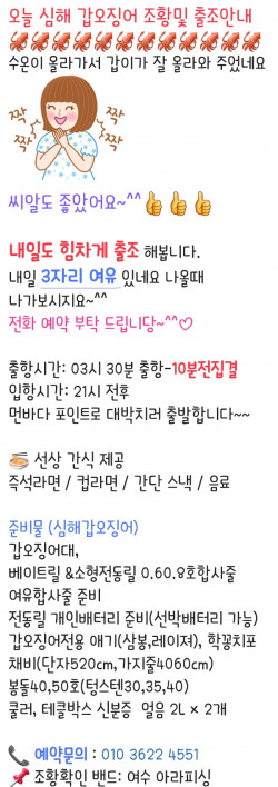 ⚓️여수 아라피싱호 예약 안내 ⚓️ ⭐️예약문의 : 010-3622-4551 , 010-5629-7913⭐️입금계좌 : 2020.4606.9103 수협 최재성⭐️오시는길 : 전남 여수시 신월1길 32 (네비게이션)⭐️홈페이지 : https://arafishing.sunsang24.com⭐️밴드주소 : https://band.us/band/95591418 ✨전화예약 부탁드립니다✨ 010 3622 4551/010 5629 7913입금시 입금자 성함 필히 문자 남겨주세요‼️입금시 우선 예약확정‼️ ⭐️선사 편의시설음료, 라면(컵라면,한강라면), 생수, 커피(믹스,원두), 차,과자, 제빙기⭐️선사 지급품석식, 야식, 미끼, 7단기둥출, 얼음, 봉돌 ⭐️선사대여품낚시대,쿨러 - 1만원 (아침에 스티로폴 1개 지급)전동릴 - 2만원- 분실 & 파손시 배상- 예약시 미리 말씀해주세요⭐️자리배정- 추첨제로 진행합니다-1번 #1번자리 배정, 2번 #2번자리 배정 순서대로-우선배정단체, 연박